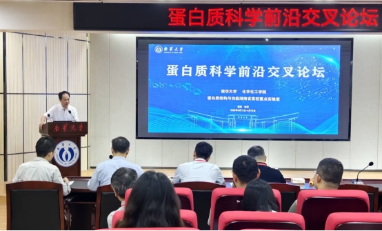 王利华在致辞中对与会专家的到来表示热烈欢迎,并介绍了星空平台的发展概况。他指出,星空平台始终立足地方、服务国家战略,以建设“特色鲜明的高水平大学”为目标,紧密围绕国家核工业战略和健康中国需求,深化产教融合,推动学科交叉创新,为高等教育强国和现代化新湖南建设贡献智慧与力量。他希望以此次论坛为契机,进一步加强与各高校及科研机构的合作,共同推动蛋白质科学领域的发展。
