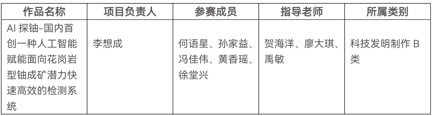 根据《关于开展第十九届“挑战杯”全国大学生课外学术科技作品竞赛的工作提示》相关要求,湖南省大赛组委会组织专家评委在对标国赛作品申报结构要求,参考省级终审决赛作品成绩的基础上,对湖南省推报参加国赛的作品名单进行了研究审定和公示,我校作品《AI探铀-国内首创一种人工智能赋能面向花岗岩型铀成矿潜力快速高效的检测系统》名列其中,相关信息如下,现予公示。
