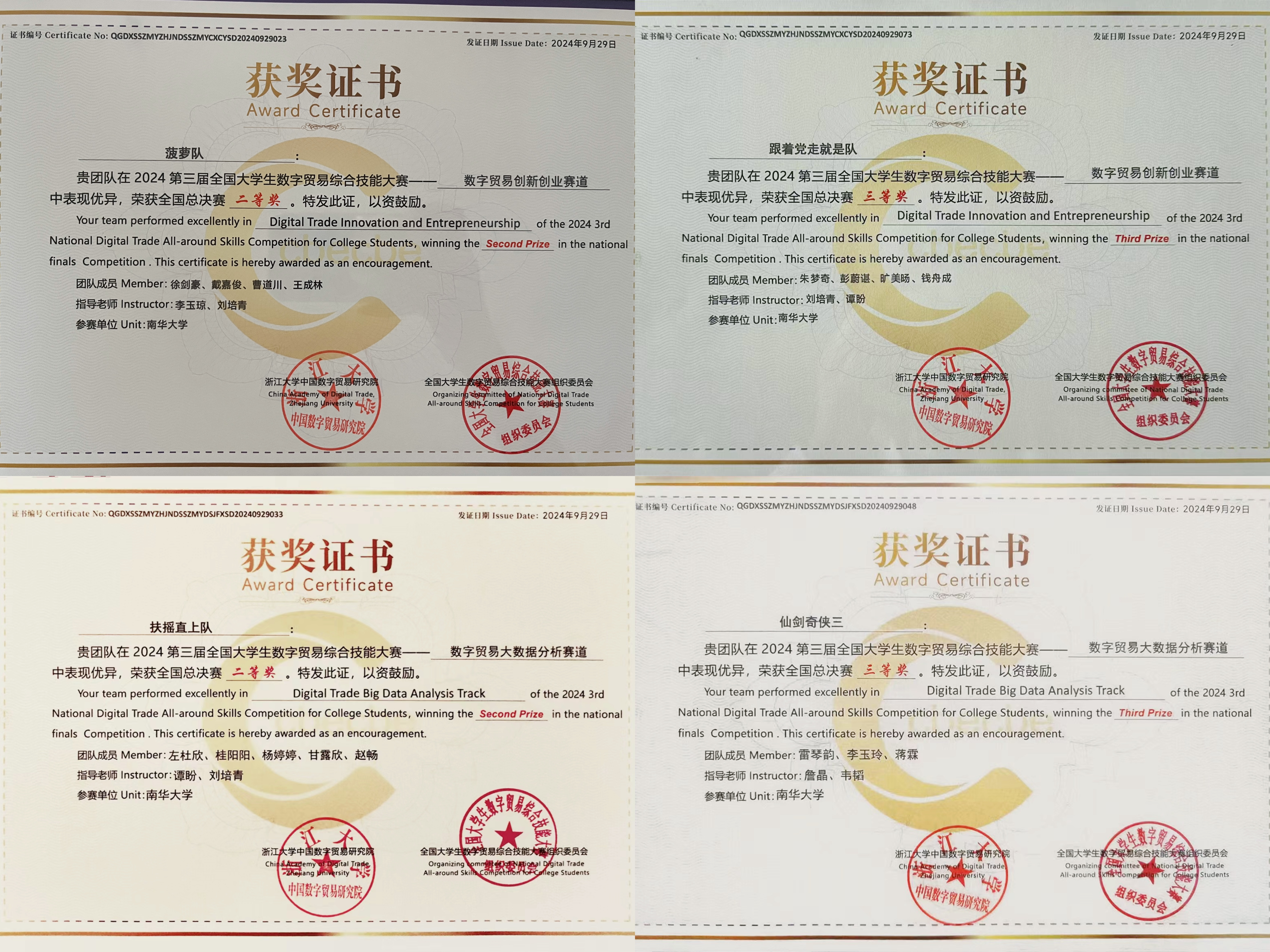 9月29日,第三届全国大学生数字贸易综合技能大赛全国总决赛在杭州落下帷幕。星空平台代表队荣获佳绩,其中“菠萝队”“扶摇直上队”分别获得创新创业赛道的和大数据分析赛道全国赛二等奖,“跟着党走就是队”“仙剑奇侠三队”分别获得创新创业赛道的和大数据分析赛道全国赛三等奖,星空平台同时获得优秀组织奖。