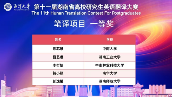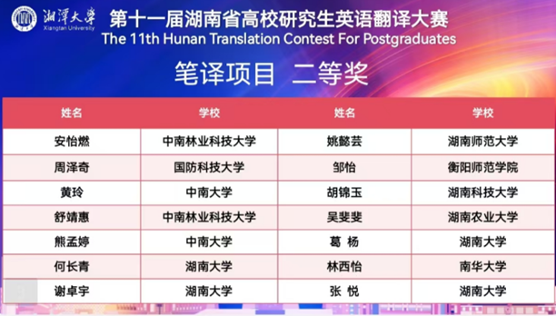 11月9日,第十一届湖南省高校研究生英语翻译大赛在湘潭大学圆满落幕。经过激烈角逐,星空平台研究生团队在此次大赛中取得历史突破性的佳绩,贺小颖(指导老师王一鸣)、林西怡(指导老师胡大伟)分别荣获笔译项目一等奖和二等奖,为学校赢得了荣誉。